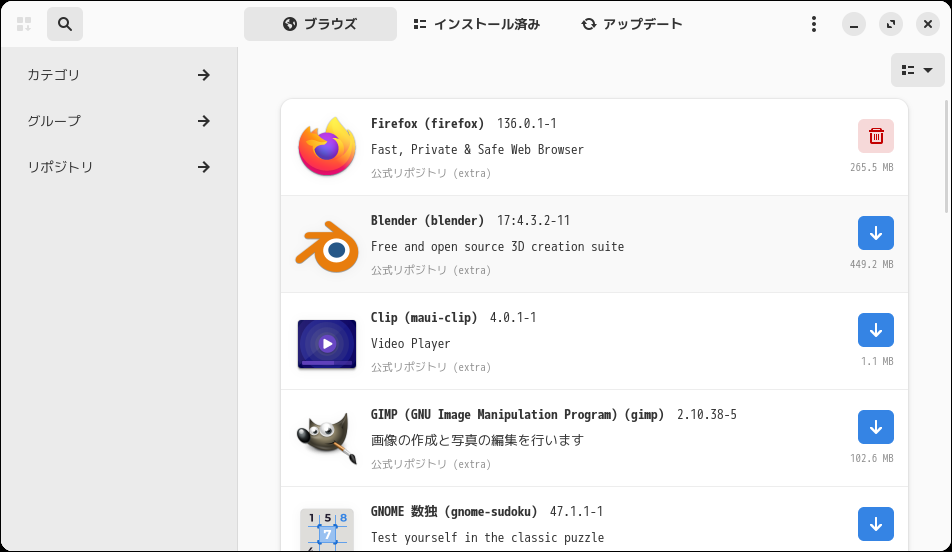 1. 概要 「Pamac」は、パッケージ管理フロントエンドプログラムです。 「231029」では、デフォルトでインストールされていましたが、今回、インストールされていなかったので、インストールして使用します。 インストール方法については、「Garuda - 250308 - 共通事項」をご参照ください。 操作等については、「Linux - 共通事項 - パッケージ管理フロントエンド」をご参照ください。 2. 起動 「スタート」→「システム」→「ソフトウエアの追加と削除」