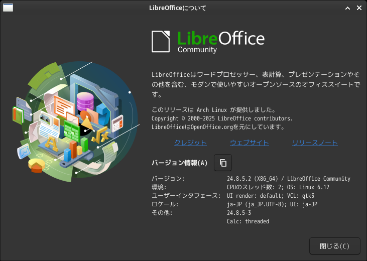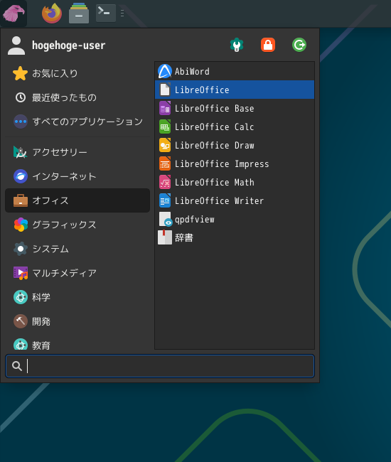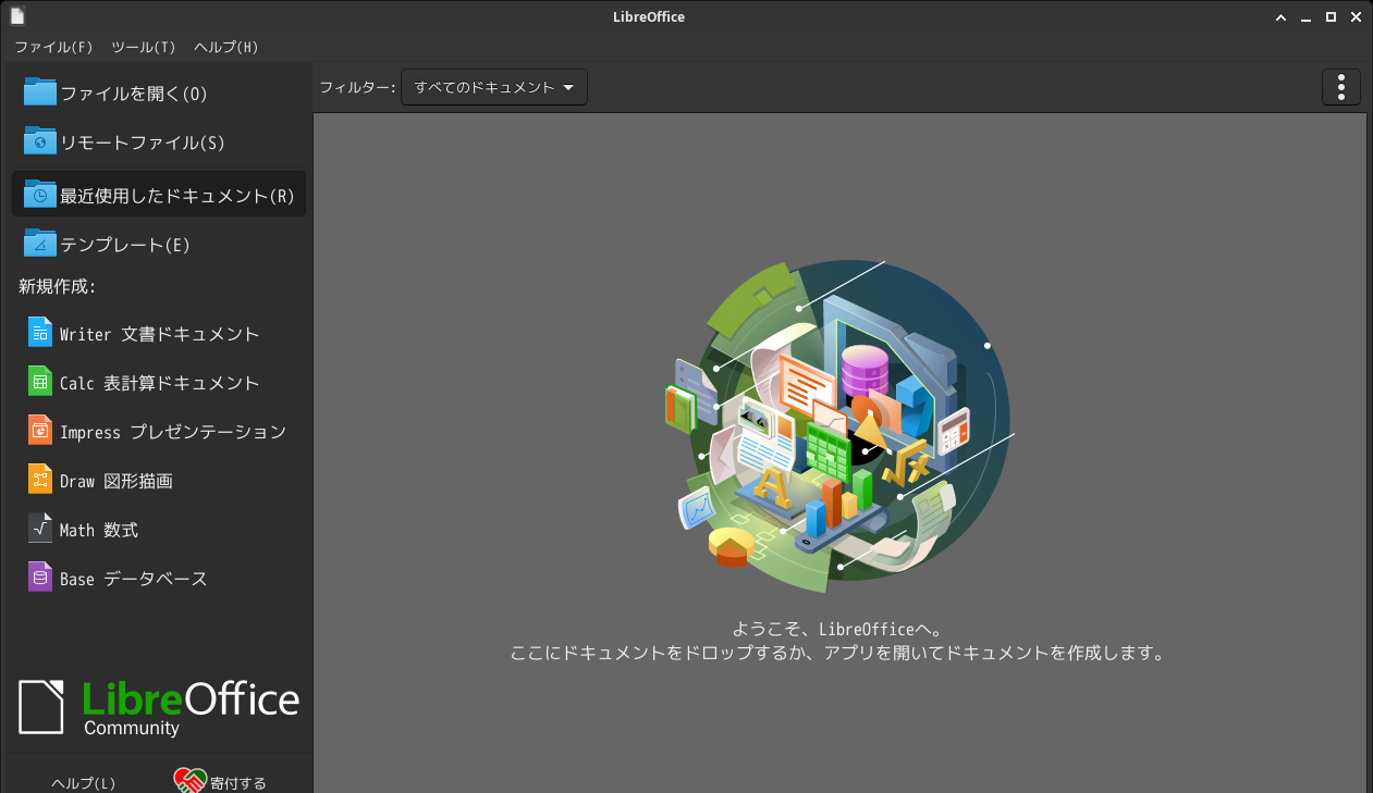 1. 概要 オフィススイートとして「LibreOffice」を使用します。 2. インストール 「Pamac」で、「libreoffice-ja」を検索して、「libreoffice-still-ja」をインストールします。 3. 起動 「スタート」→「オフィス」→「LibreOffice Start Center」