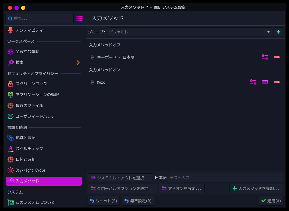 キーボードレイアウトを日本語にしていますが、さらに、入力メソッドで、下記の設定を行うことが必要です。