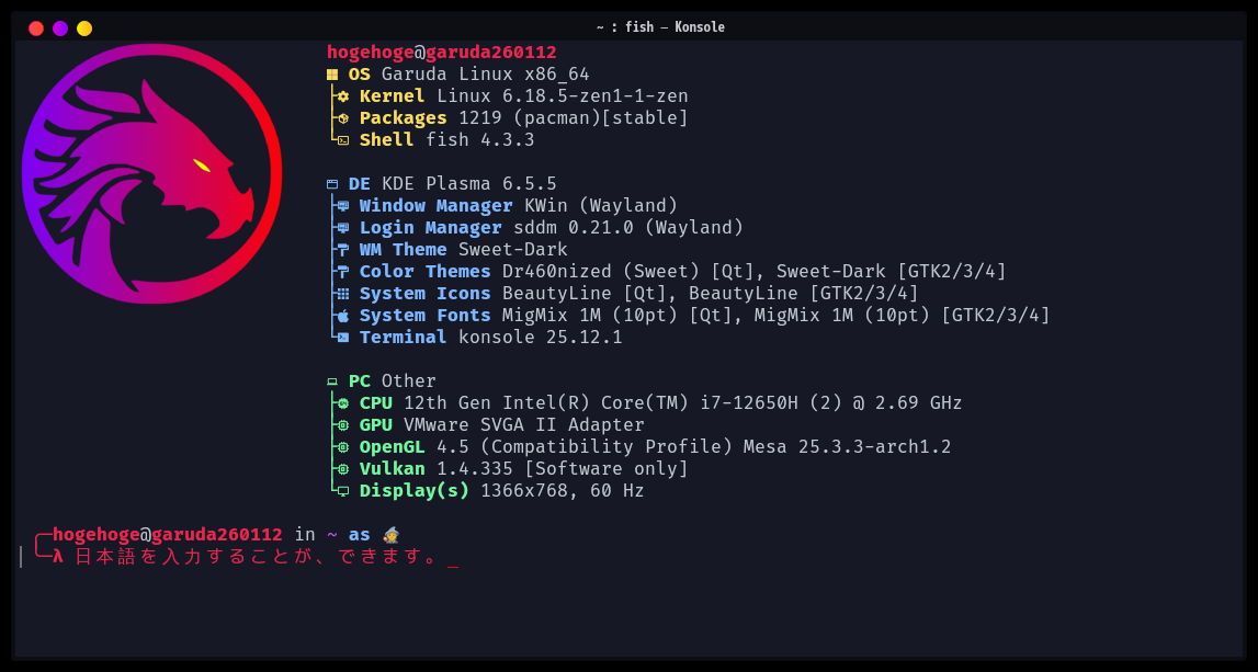 なぜか、「fcitx5」が、自動実行してくれないので、日本語入力を行う場合は、毎回、入力メソッドで「fcitx5」の起動が必要になります。