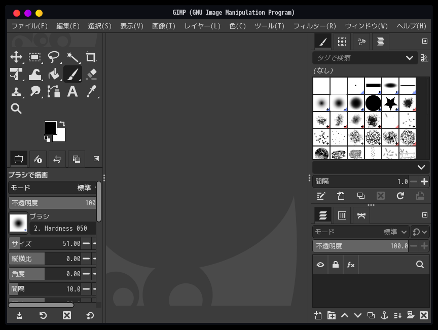 「閉じる」 起動直後の状態です。 2026年1月19日の時点で、下記のバージョンでした。 操作については、「画像編集ソフト - GIMP」に掲載しています。 上記は簡単なものですので、詳細なものがほしい方は、各所に初歩の手引きから応用編までありますので、そちらを参考にしてください。 |