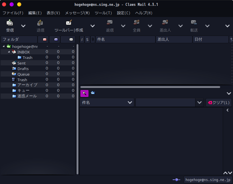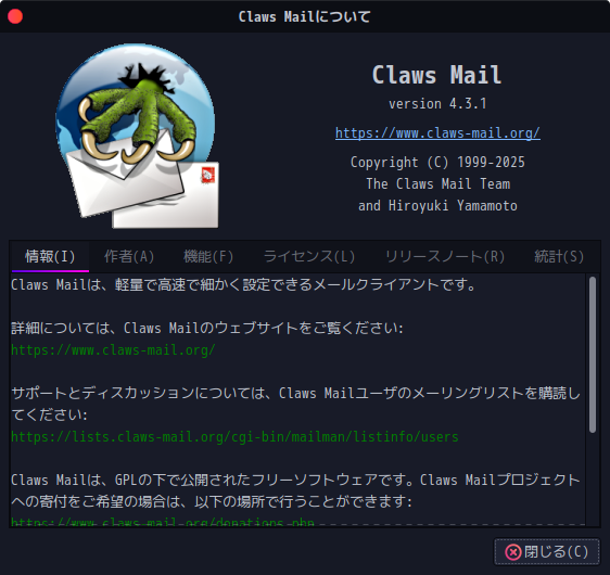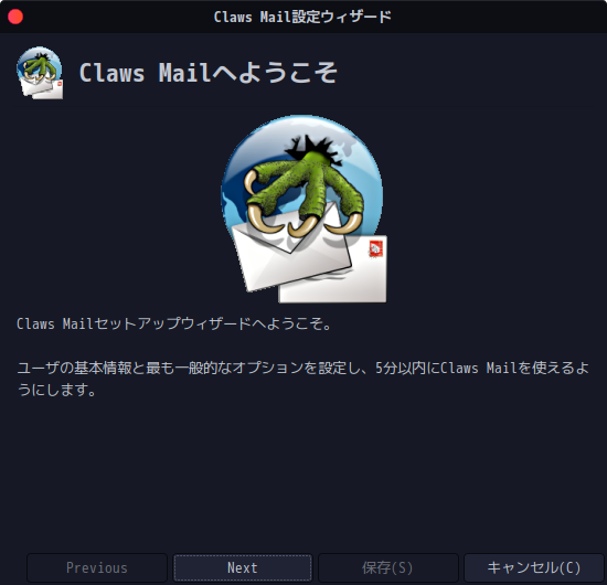 初回起動時は、「設定ウィザード」から始まります。 起動直後の状態です。 2026年1月19日の時点で、下記のバージョンでした。 「設定ウィザード」他、操作方法に関しては、「メール クライアント ソフト - Claws Mail」をご参照ください。 |