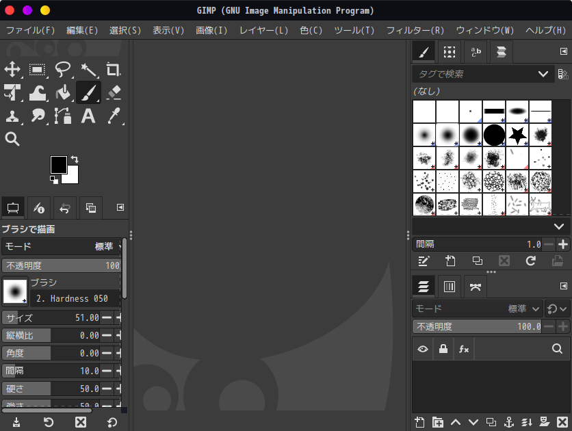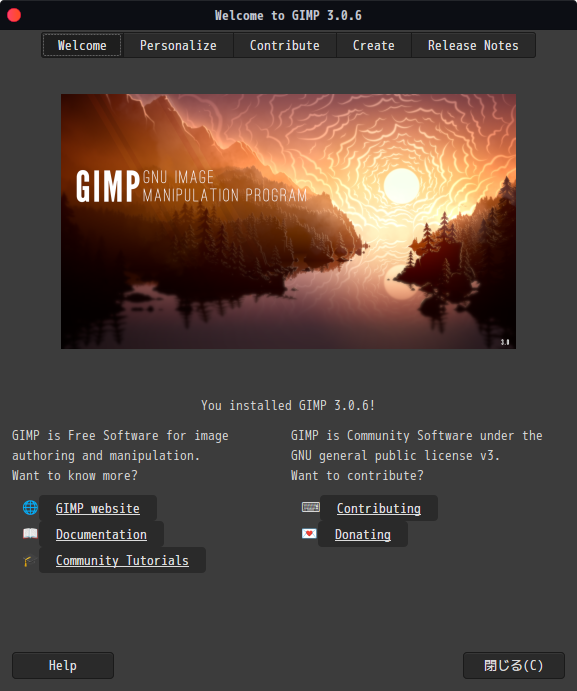「閉じる」 起動直後の状態です。 2026年1月19日の時点で、下記のバージョンでした。 操作については、「画像編集ソフト - GIMP」に掲載しています。 上記は簡単なものですので、詳細なものがほしい方は、各所に初歩の手引きから応用編までありますので、そちらを参考にしてください。 |
