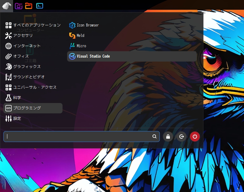 (何故か「アクセサリ」にカテゴライズされています。気に食わないときは「/usr/share/applications/visual-studio-code.desktop」をいじりましょう)