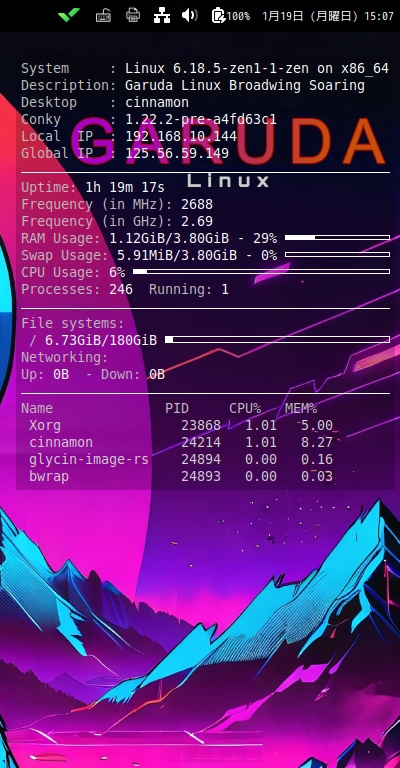 ログイン後に、デスクトップ右に、「Conky」の表示が現れます。