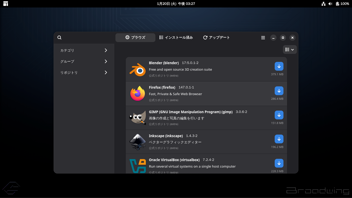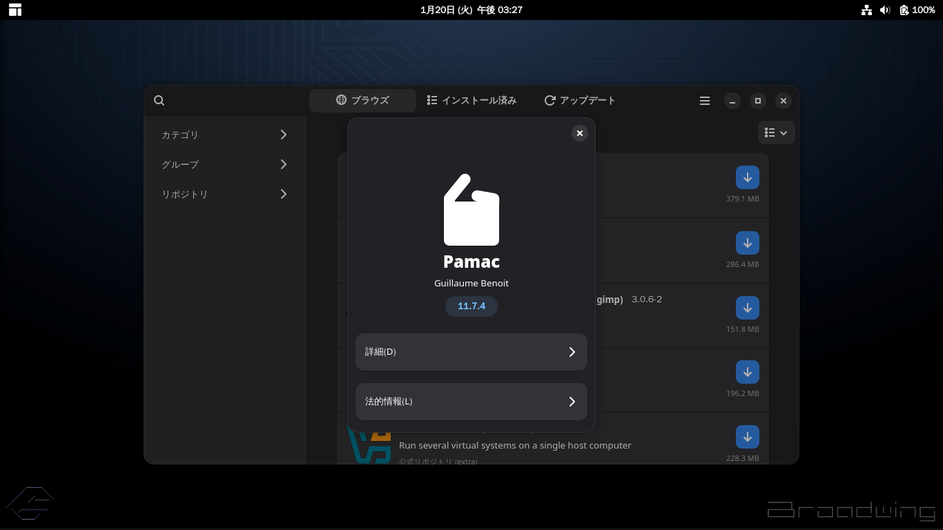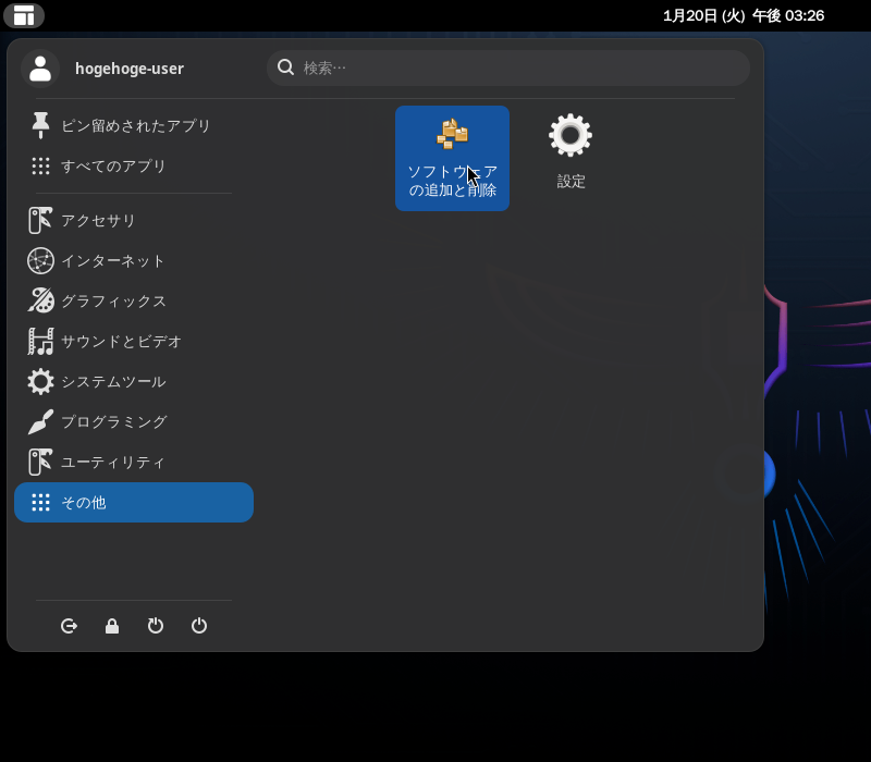 1. 概要 「Pamac」は、パッケージ管理フロントエンドプログラムです。 操作等については、「Linux - 共通事項 - パッケージ管理フロントエンド」をご参照ください。 デフォルトでは、インストールされていません。 インストールについては、「Garuda - 260115 - 共通事項」をご参照ください。 2. 起動 「スタート」→「その他」→「ソフトウエアの追加と削除」