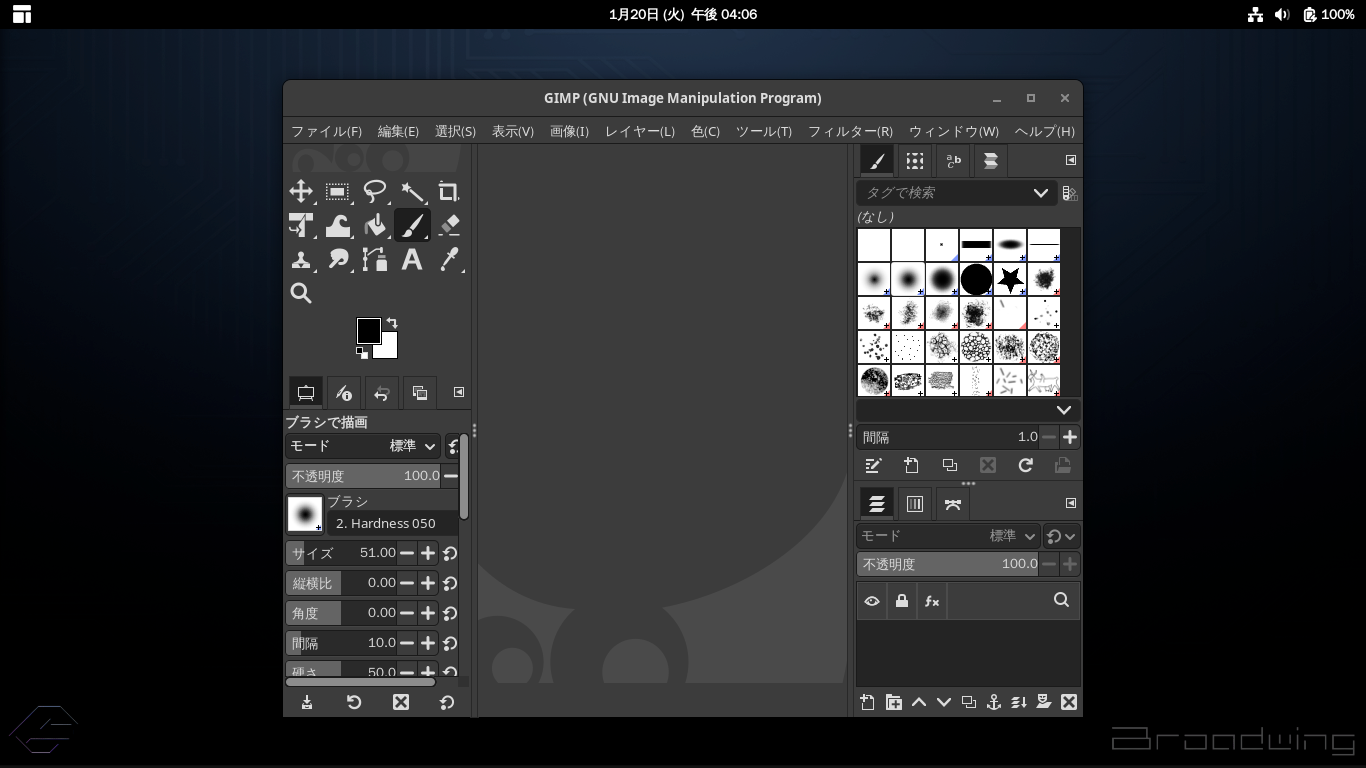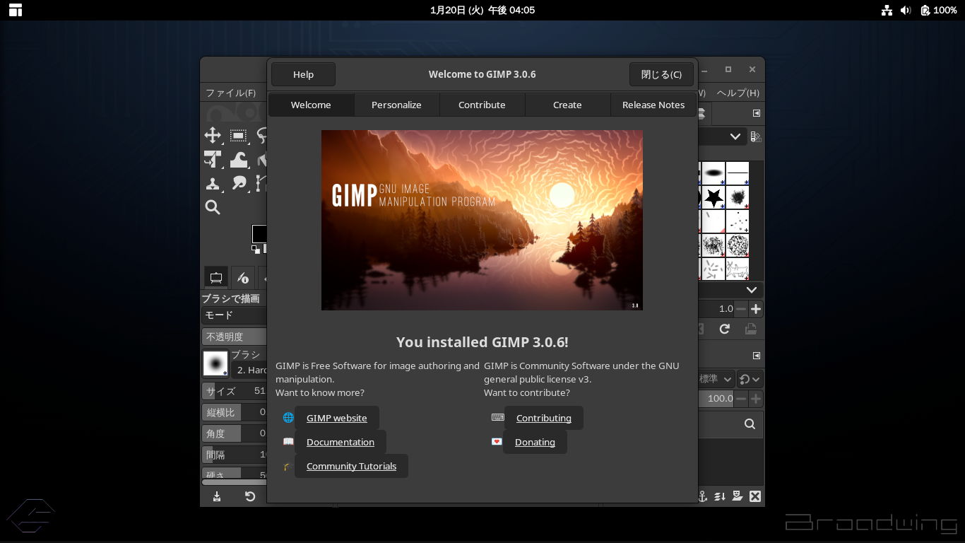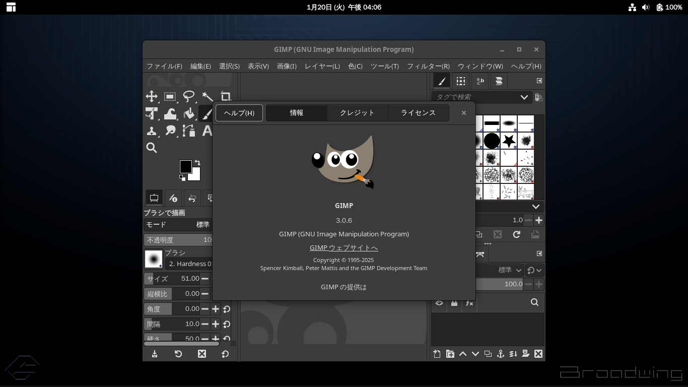 「閉じる」 起動直後の状態です。 2026年1月20日の時点で、下記のバージョンでした。 操作については、「画像編集ソフト - GIMP」に掲載しています。 上記は簡単なものですので、詳細なものがほしい方は、各所に初歩の手引きから応用編までありますので、そちらを参考にしてください。 |