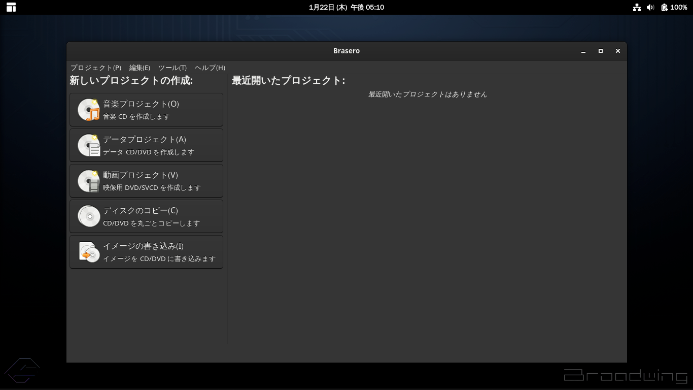 1. 概要 光ディスクのライティングソフトとして「Brasero」を使用します。 2. インストール 「Pamac」で、「brasero」を検索して、インストールします。 3. 起動 「スタート」→「サウンドとビデオ」→「Brasero」