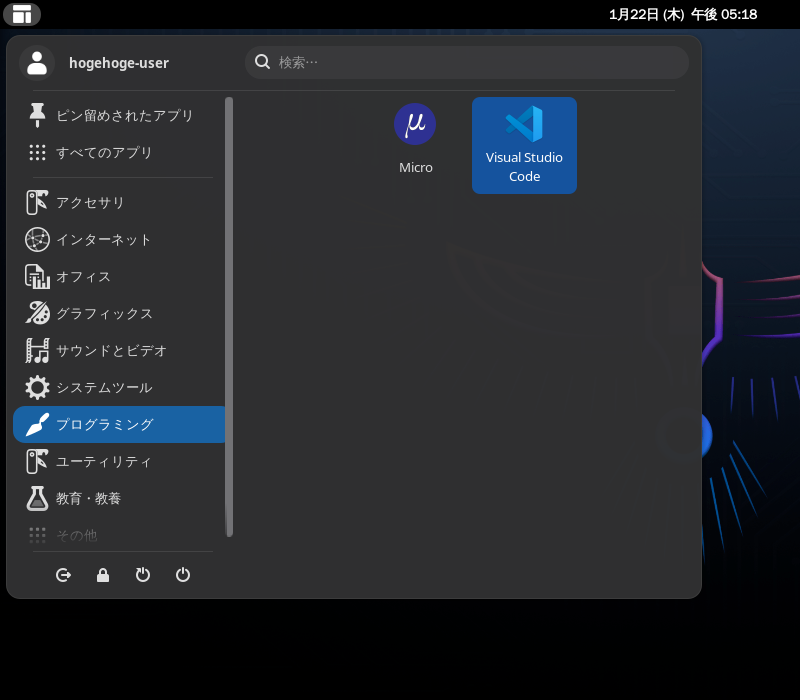 1. 概要 開発環境として、「Visual Studio Code」を使用します。 2. インストール 「Pamac」で、「visual-studio-code-bin」を検索して、インストールします。 3. 起動 「スタート」→「プログラミング」→「Visual Studio Code」