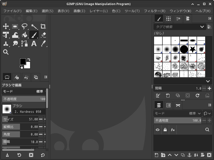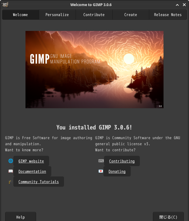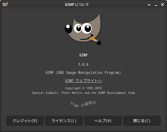 「閉じる」 起動直後の状態です。 2026年1月23日の時点で、下記のバージョンでした。 操作については、「画像編集ソフト - GIMP」に掲載しています。 上記は簡単なものですので、詳細なものがほしい方は、各所に初歩の手引きから応用編までありますので、そちらを参考にしてください。 |