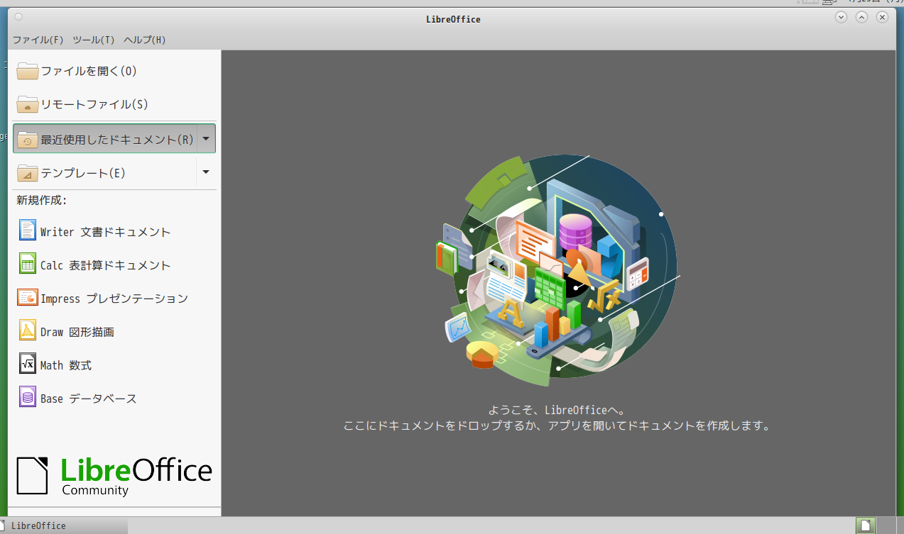 起動直後の状態です。 2023年1月23日の時点で、下記のバージョンでした。 操作方法等については「オフィススィート LibreOffice」をご参照ください。 |