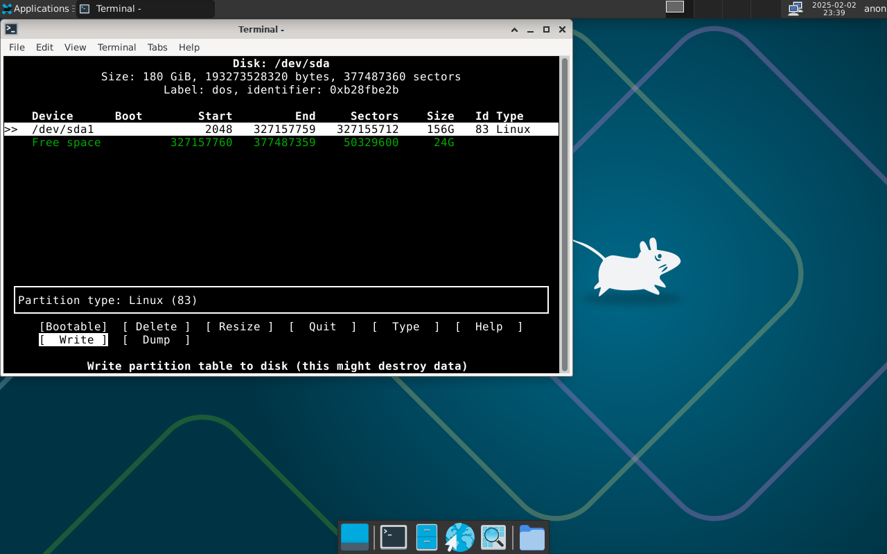 同じ要領で、残りの領域を「swap」として「Write」します。