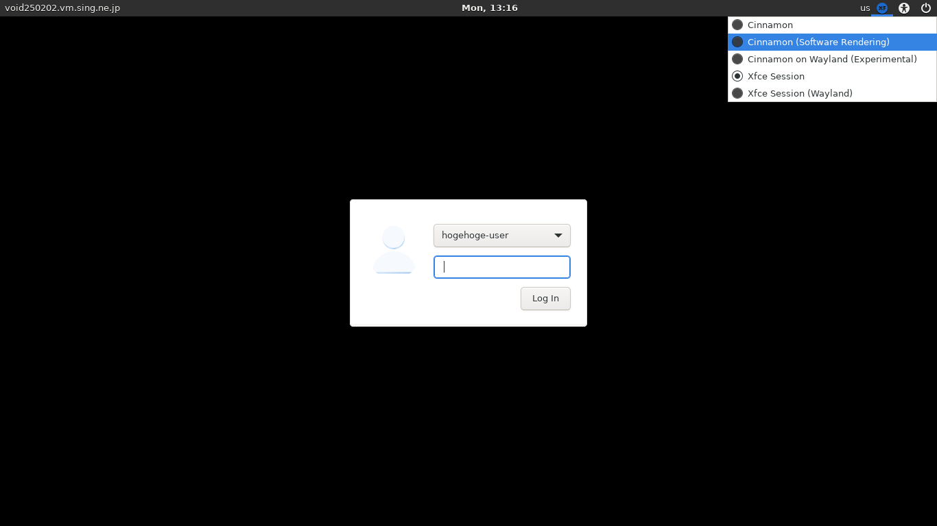 「Cinnamon(Software Rendering)」(これが安全)を選択して、ログインすれば、「Cinnamon」の環境へログインできます。