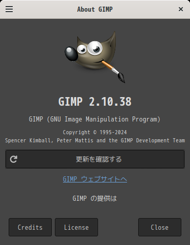 起動直後の状態です。 2025年2月3日の時点で、下記のバージョンでした。 操作については、「画像編集ソフト GIMP2」に掲載しています。 上記は簡単なものですので、詳細なものがほしい方は、各所に初歩の手引きから応用編までありますので、そちらを参考にしてください。 |