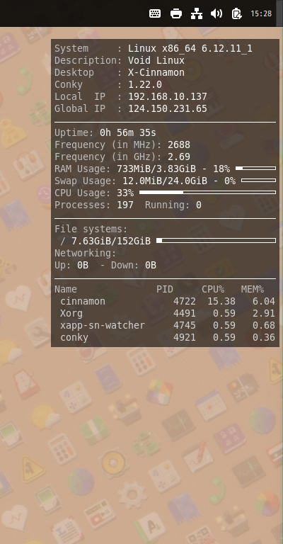 再ログイン後、デスクトップ右に、「Conky」の表示が現れます。