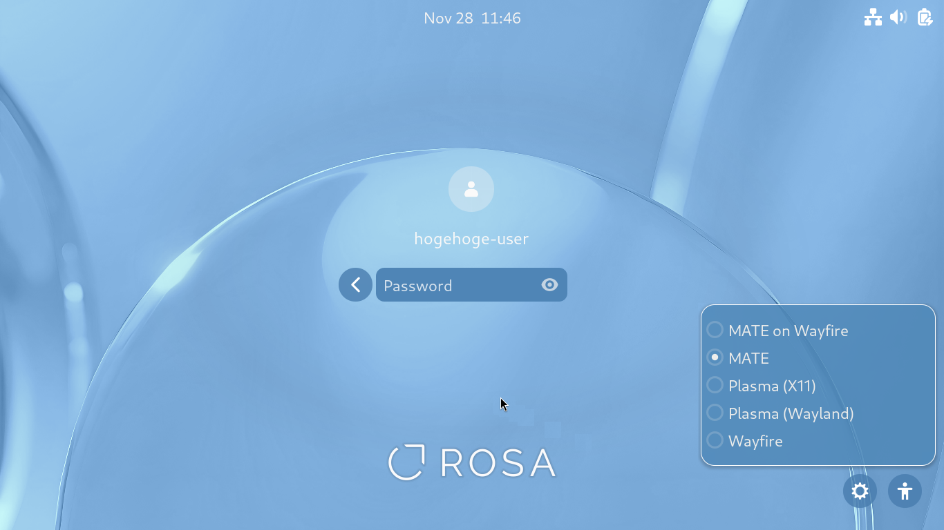 ログイン画面のセッション選択で、「MATE」を選択すれば、「MATE」のデスクトップ環境へログインすることができます。