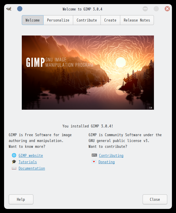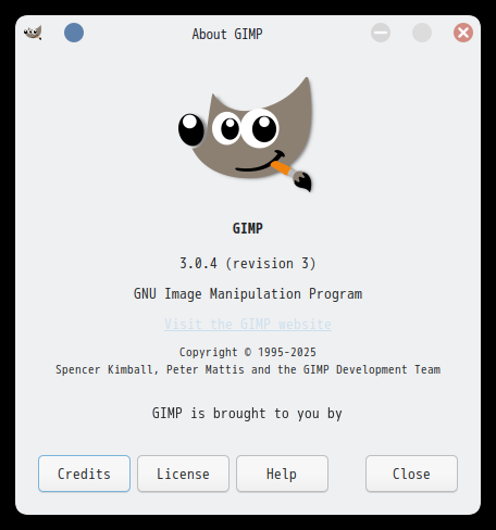 「Close」 起動直後の状態です。 これも日本語化されておりません。 2025年11月27日の時点で、下記のバージョンでした。 操作については、「画像編集ソフト - GIMP」に掲載しています。 上記は簡単なものですので、詳細なものがほしい方は、各所に初歩の手引きから応用編までありますので、そちらを参考にしてください。 |