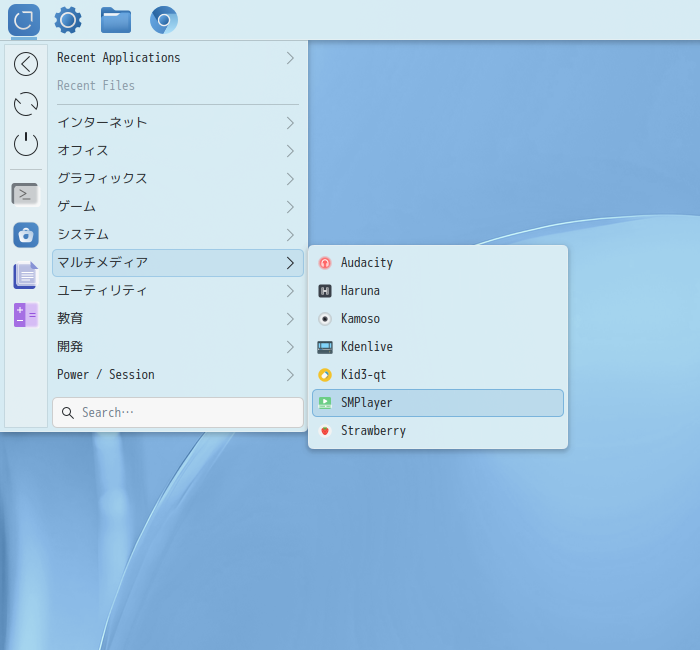1. 概要 マルチメディアプレイヤーとして、「SMPlayer」を使用します。 2. インストール 「dnfdragora」で、「smplayer」を検索して、インストールします。 3. 起動 「スタート」→「マルチメディア」→「SMPlayer」