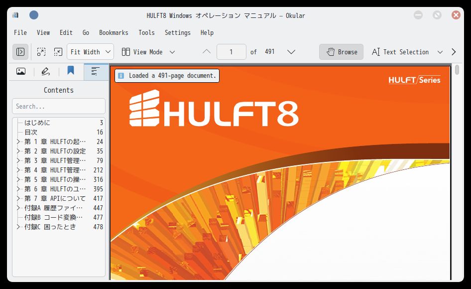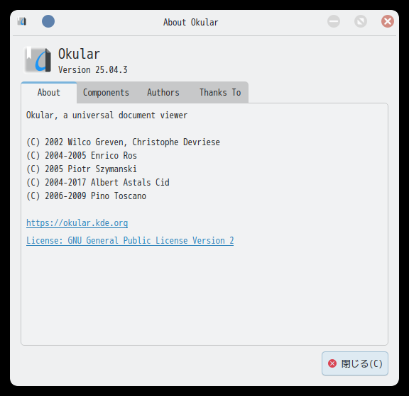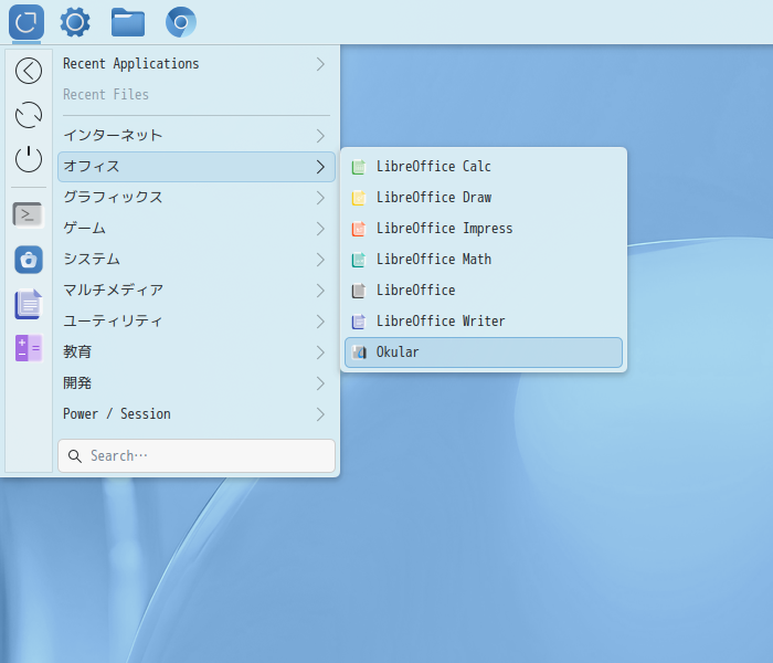 1. 概要 ドキュメントビューアとして「Okular」を使用します。 「Okular」は、デフォルトでインストールされています。 2. 起動 「スタート」→「オフィス」→「Okular」