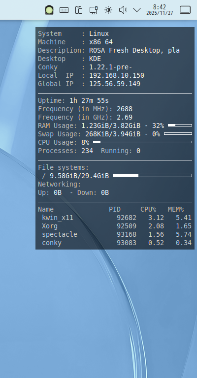システム・マシン・ディストリビューション・デスクトップ名・「Conky」のバージョン・アドレスを複数行で表示。