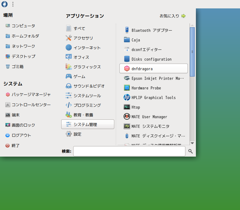 1. 概要 パッケージ管理フロントエンドとして、「dnfdragora」が用意されています。 2. 起動 「スタート」→「システム管理」→「dnfdragora」