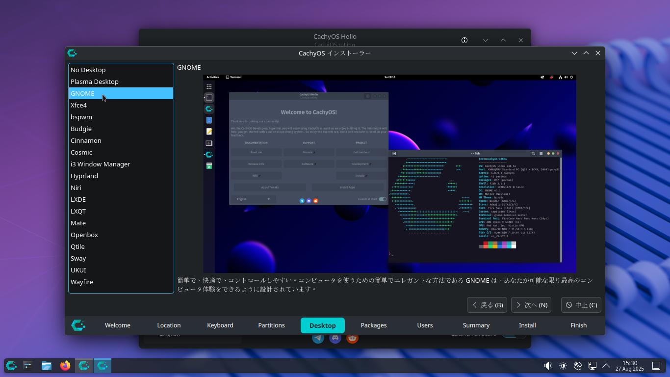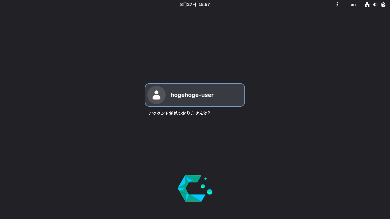 ログイン画面が表示されれば、インストールは、完了です。 インストール時は、「Plasma(Wayland)」「Plasma(X11)」の選択肢がありましたが、インストール後は、「Plasma(Wayland)」へしかログインできないようです。 |