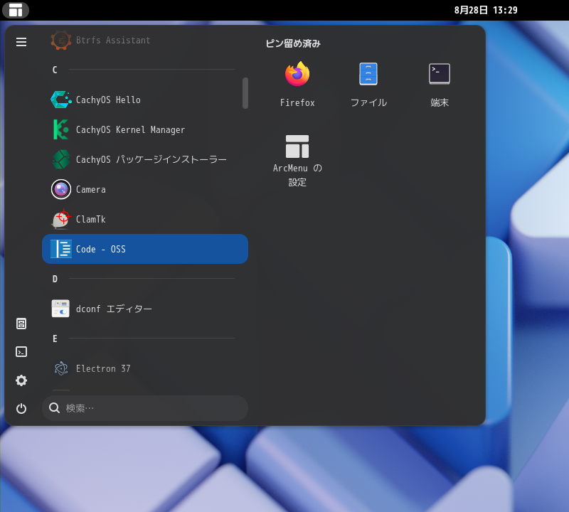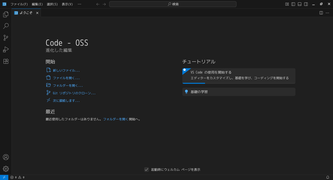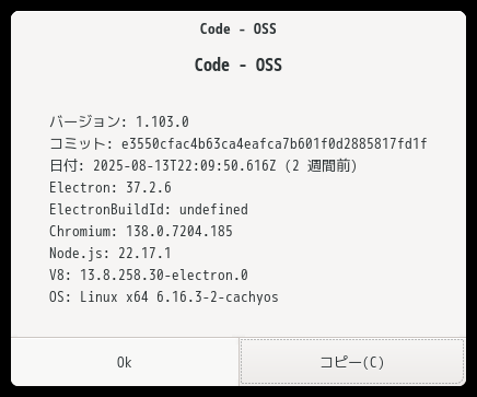1. 概要 開発環境として、「Visuall Studio Code」を使用します。 2. インストール 「CachyOS Package Installer」で、「vscode」を検索して、インストールします。 3. 起動 「スタート」→「C」→「Code OSS」