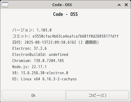 1. 概要 開発環境として、「Visuall Studio Code」を使用します。 2. インストール 「CachyOS Package Installer」で、「vscode」を検索して、インストールします。 3. 起動 「スタート」→「開発」→「Code OSS」