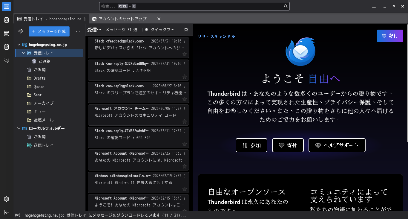 初回起動時は、「アカウント設定」が起動します。 起動直後に、受信ボックスを開いた状態です。 2025年9月1日の時点で、下記のバージョンでした。 操作方法等は「メール クライアント ソフト - Thunderbird」をご参照ください。 |