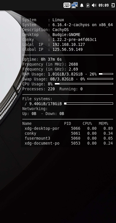 ログイン後、デスクトップ右に、「Conky」の表示が現れます。