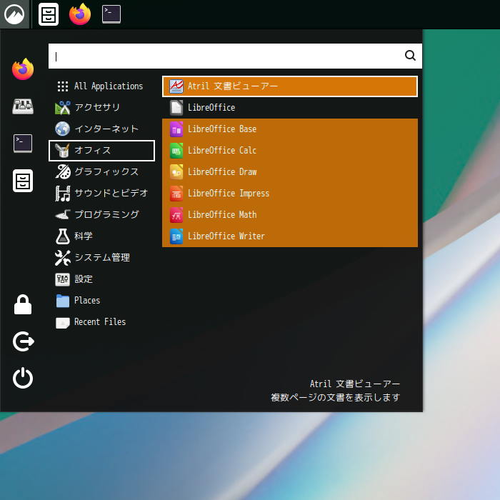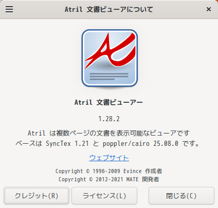 1. 概要 ドキュメントビューアとして、「Atril」を使用します。 「Atril」は、デフォルトでインストールされています。 2. インストール 「Pamac」で、「atril」を検索して、インストールします。 3. 起動 「スタート」→「オフィス」→「Atril 文書ビューア」