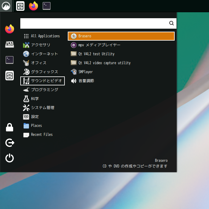 1. 概要 光ディスクライティングソフトとして、「Brasero」を使用します。 2. インストール 「Pamac」で、「brasero」を検索して、インストールします。 3. 起動 「スタート」→「サウンドとビデオ」→「Brasero」