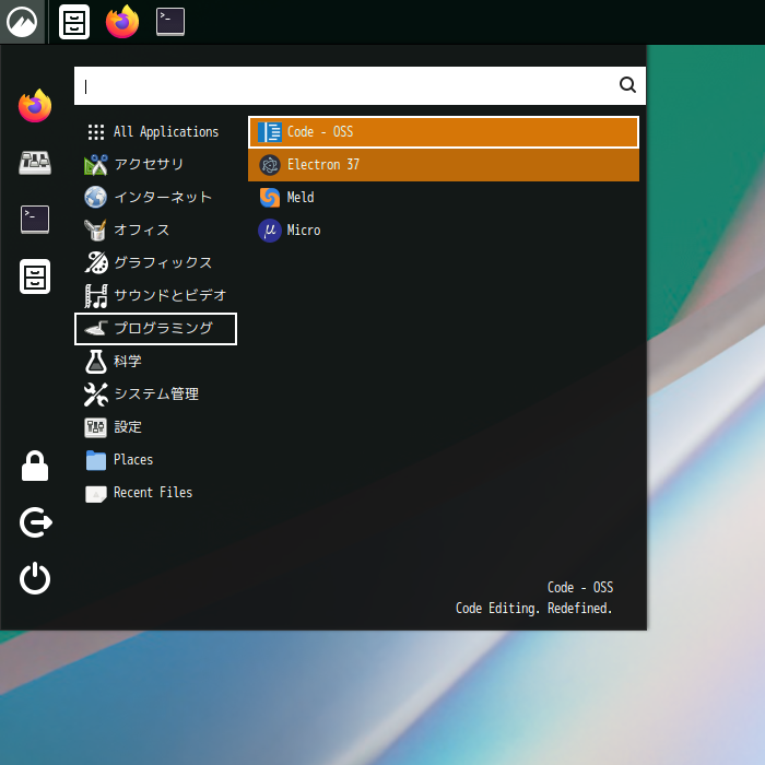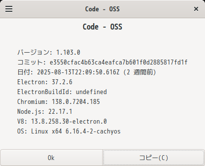 1. 概要 開発環境として、「Visuall Studio Code」を使用します。 2. インストール 「CachyOS Package Installer」で、「vscode」を検索して、インストールします。 3. 起動 「スタート」→「開発」→「Code OSS」