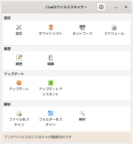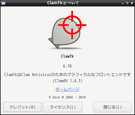 1. 概要 「ClamTk」は、「GUI」で操作するアンチウィルスソフトです。 2. インストール 「Pamac」で、「clamtk」を検索してインストールします。 3. 起動 「スタート」→「アクセサリ」→「ClamTk」