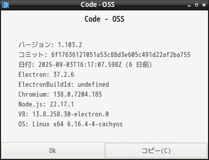 1. 概要 開発環境として、「Visual Studio Code」を使用します。 2. インストール 「CachyOS Package Installer」で、「vscode」を検索して、インストールします。 3. 起動 「スタート」→「Development」→「Code OSS」
