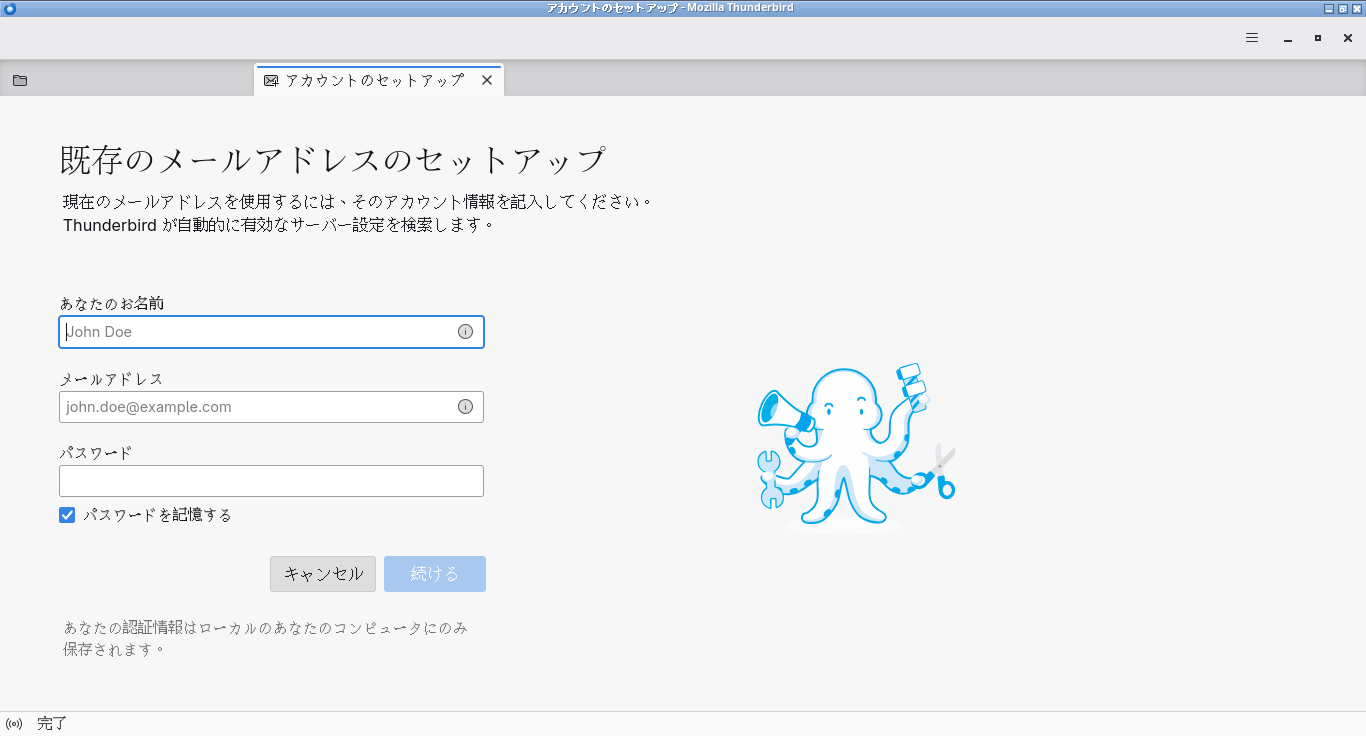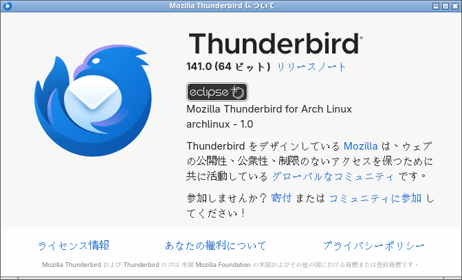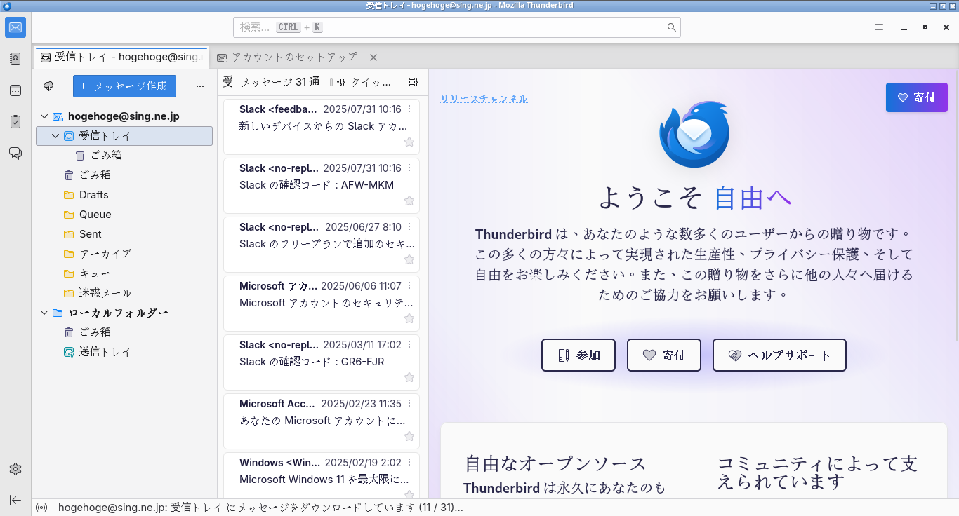 初回起動時は、「アカウント設定」が起動します。 起動直後に、受信ボックスを開いた状態です。 2025年9月5日の時点で、下記のバージョンでした。 操作方法等は「メール クライアント ソフト - Thunderbird」をご参照ください。 |