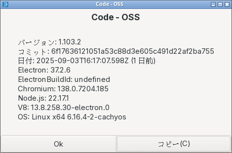 1. 概要 開発環境として、「Visuall Studio Code」を使用します。 2. インストール 「CachyOS Package Installer」で、「vscode」を検索して、インストールします。 3. 起動 「スタート」→「開発」→「Code OSS」
