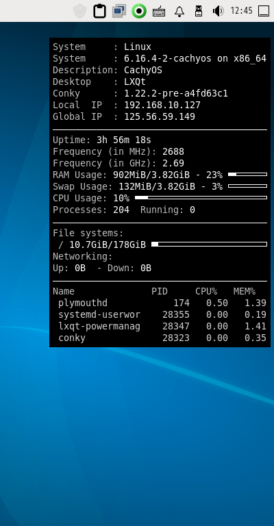 ログイン後、デスクトップ右に、「Conky」の表示が現れます。