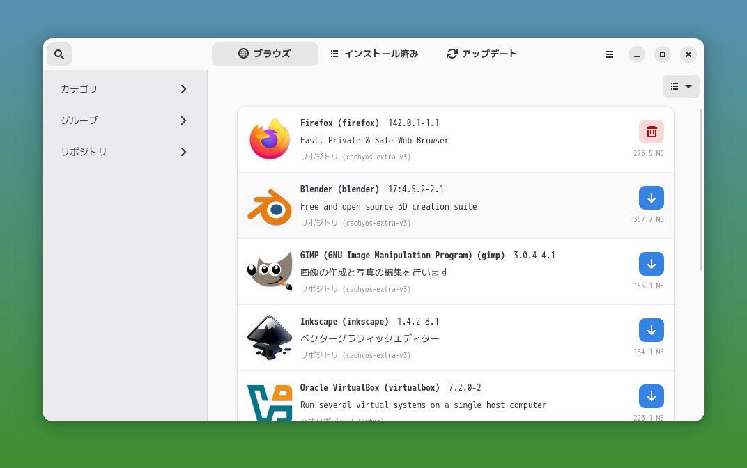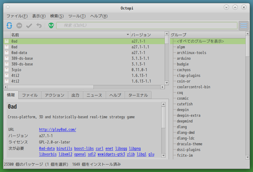 パッケージ管理フロントエンドとして「CachyOS Package Installer」と「Octopi」がデフォルトでインストールされています。