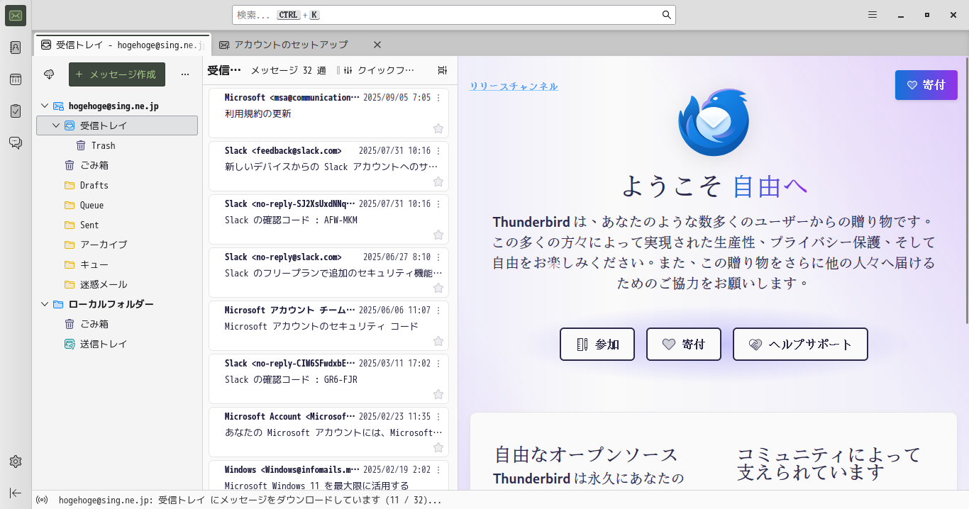 初回起動時は、「アカウント設定」が起動します。 起動直後に、受信ボックスを開いた状態です。 2025年9月9日の時点で、下記のバージョンでした。 操作方法等は「メール クライアント ソフト - Thunderbird」をご参照ください。 |