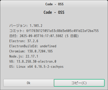 1. 概要 開発環境として、「Visuall Studio Code」を使用します。 2. インストール 「CachyOS Package Installer」で、「vscode」を検索して、インストールします。 3. 起動 「スタート」→「プログラミング」→「Code OSS」