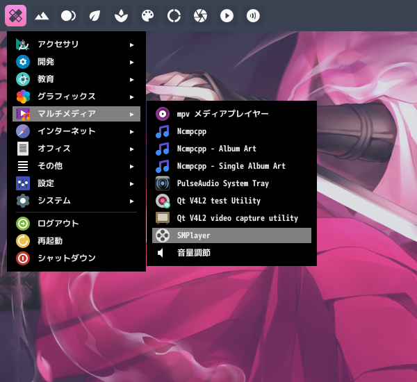 1. 概要 マルチメディアプレイヤーとして、「SMPlayer」を使用します。 2. インストール 「Pamac」で、「smplayer」を検索して、インストールします。 3. 起動 「スタート」→「マルチメディア」→「SMPlayer」