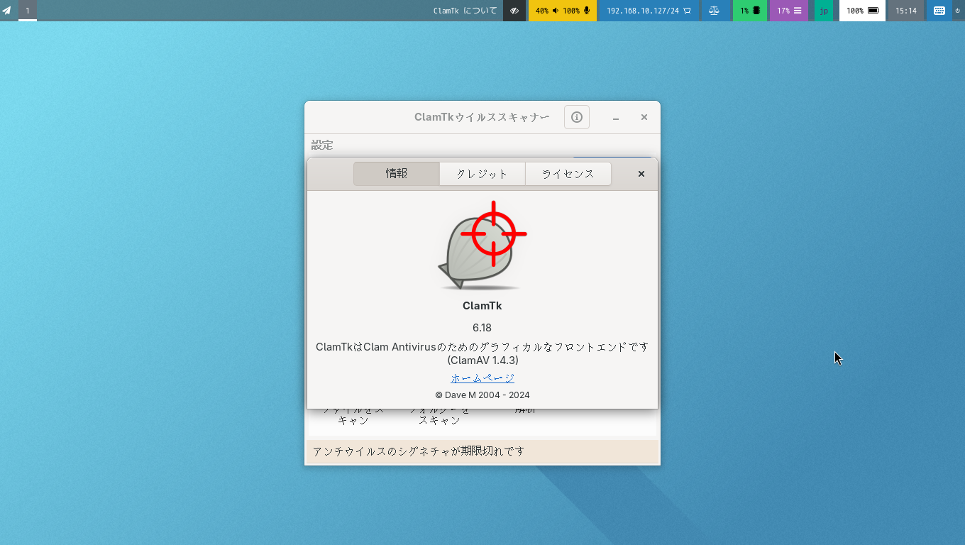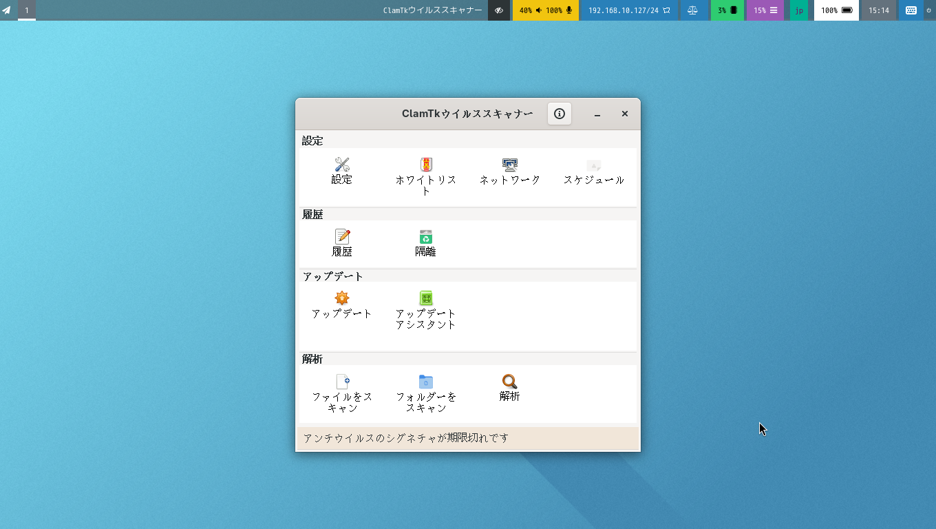 1. 概要 「ClamTk」は、「GUI」で操作するアンチウィルスソフトです。 2. インストール 「root」ユーザ権限で。 pacman -S clamtk 3. 起動 「スタート」→「アクセサリ」→「ClamTk」
