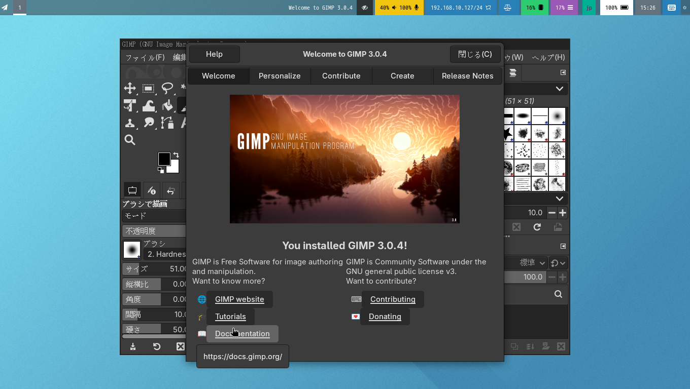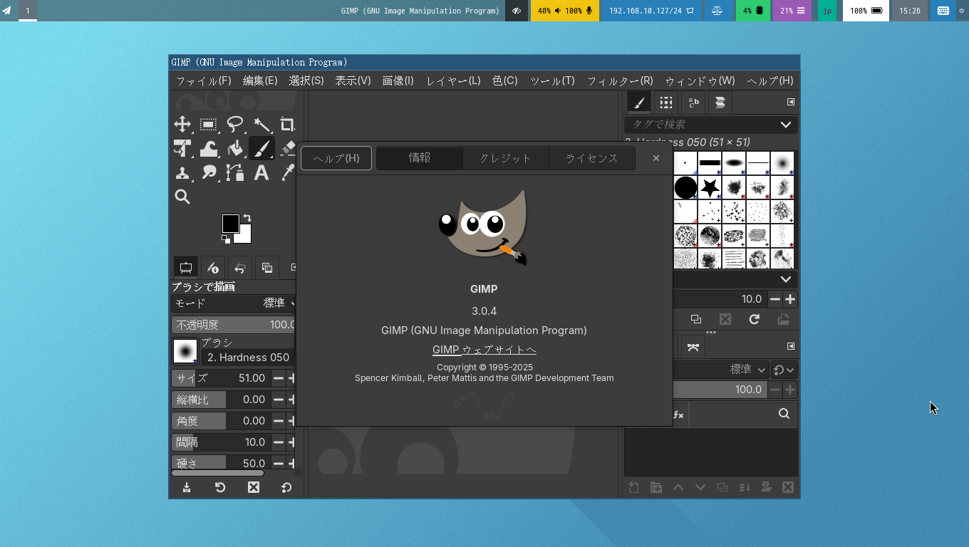 「閉じる」 起動直後の状態です。 2025年9月22日の時点で、下記のバージョンでした。 操作については、「画像編集ソフト GIMP」に掲載しています。 上記は簡単なものですので、詳細なものがほしい方は、各所に初歩の手引きから応用編までありますので、そちらを参考にしてください。 |
