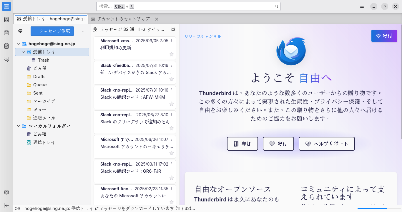 初回起動時は、「アカウント設定」が起動します。 起動直後に、受信ボックスを開いた状態です。 2025年9月8日の時点で、下記のバージョンでした。 操作方法等は「メール クライアント ソフト - Thunderbird」をご参照ください。 |