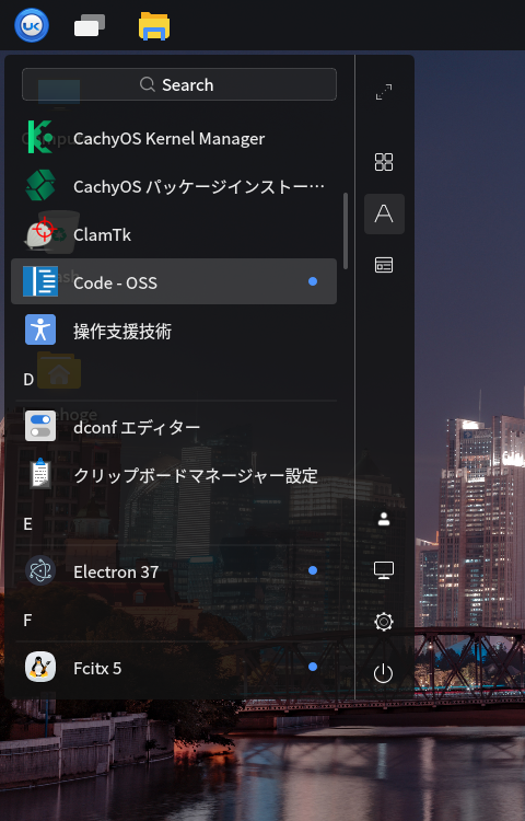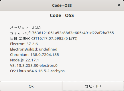 1. 概要 開発環境として、「Visuall Studio Code」を使用します。 2. インストール 「CachyOS Package Installer」で、「vscode」を検索して、インストールします。 3. 起動 「スタート」→「C」→「Code OSS」