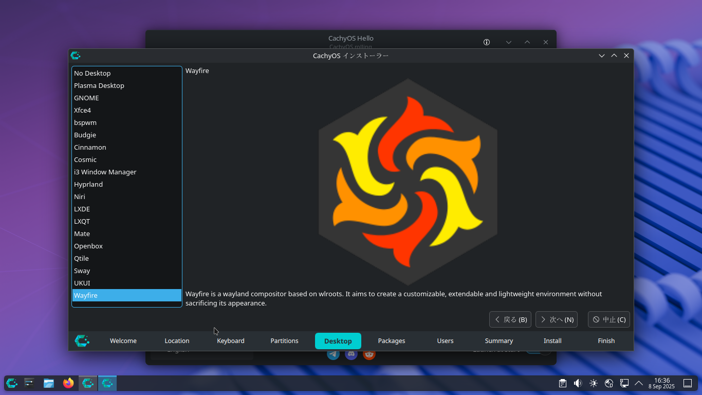 1. 概要 インストールに関しては、「CachyOS - 250824 - 共通事項」をご参照ください。 2. インストール インストール時に、デスクトップ選択画面で、「WayFire」を選択します。
