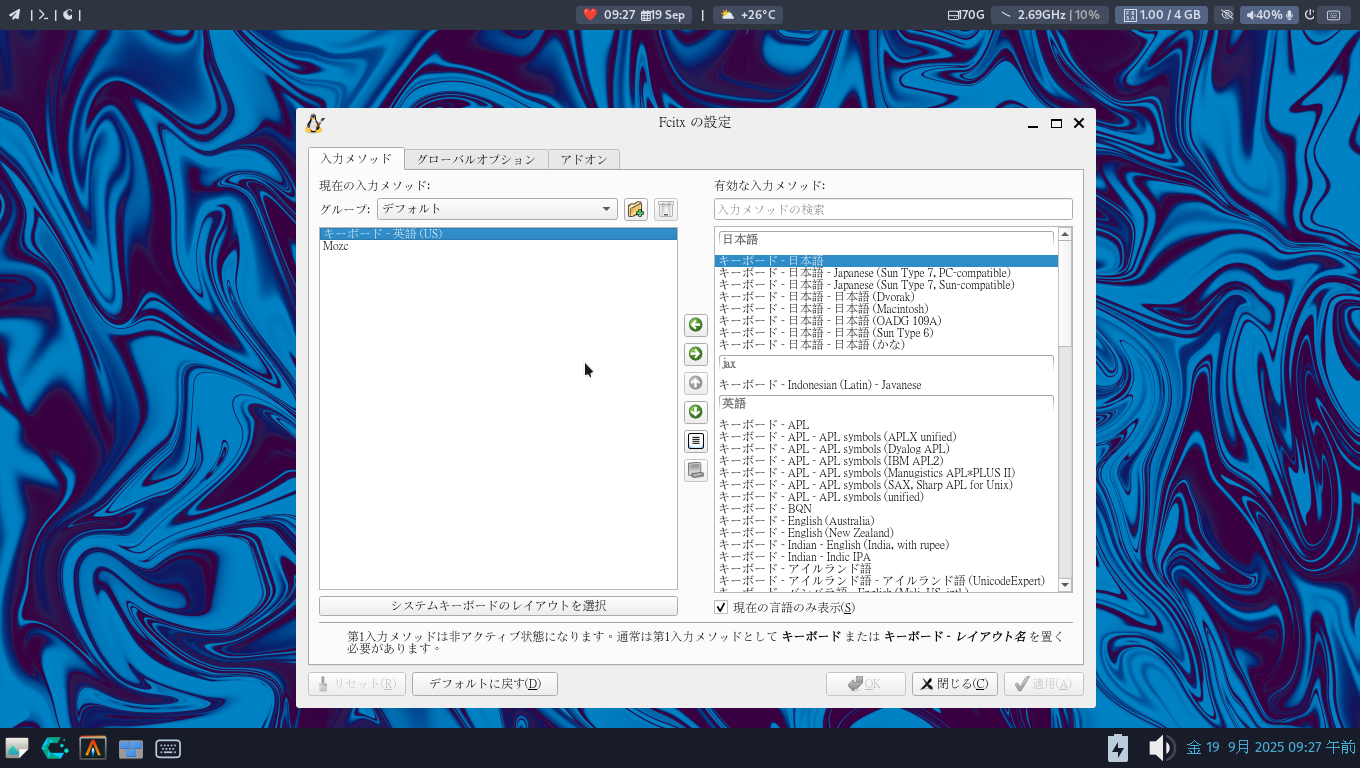日本語入力として、「fcitx5-mozc」をインストールして使用します。