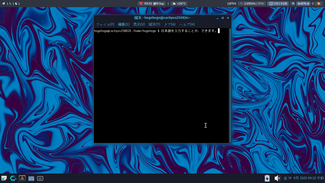 ただし、「alacritty」では、日本語入力ができないので、上記は「xfce4-terminal」で確認しました。