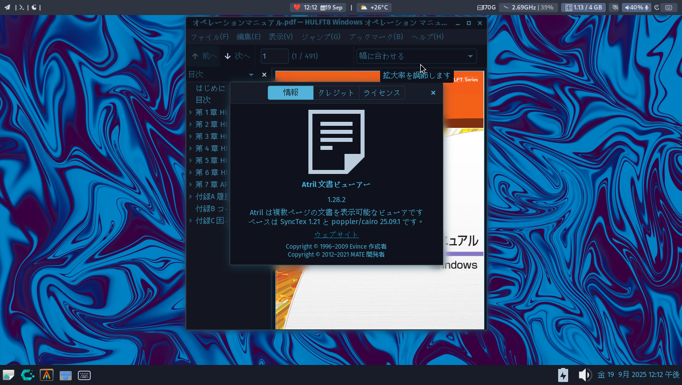 1. 概要 ドキュメントビューアとして、「Atril」を使用します。 「Atril」は、デフォルトでインストールされています。 2. インストール 「Pamac」で、「atril」を検索して、インストールします。 3. 起動 「スタート」→「オフィス」→「Atril 文書ビューア」